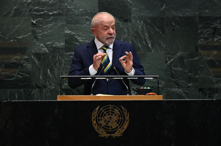 9月23日,在位于纽约的联合国总部,巴西总统卢拉出席第80届联合国大会一般性辩论时发表讲话,强调国际社会应捍卫多边主义和民主制度、反对单边制裁和干涉主权国家,并呼吁维护拉美地区和平。新华社记者 李睿 摄