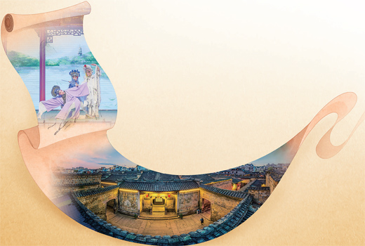 左上图:古城内正在进行的梅林戏演出。 李少兰摄 右下图:航拍泰宁古城。 郑和兴摄