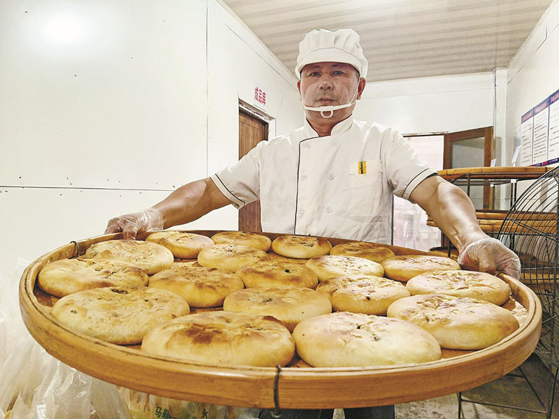 潘小平十六七岁学做糕点,一做就是30多年,原料均精挑细选。“每年只做农历七月十四到八月十四,能卖两三万斤。”他说,中秋临近,买月饼的村民与经销商络绎不绝。(雨宣 文/图)