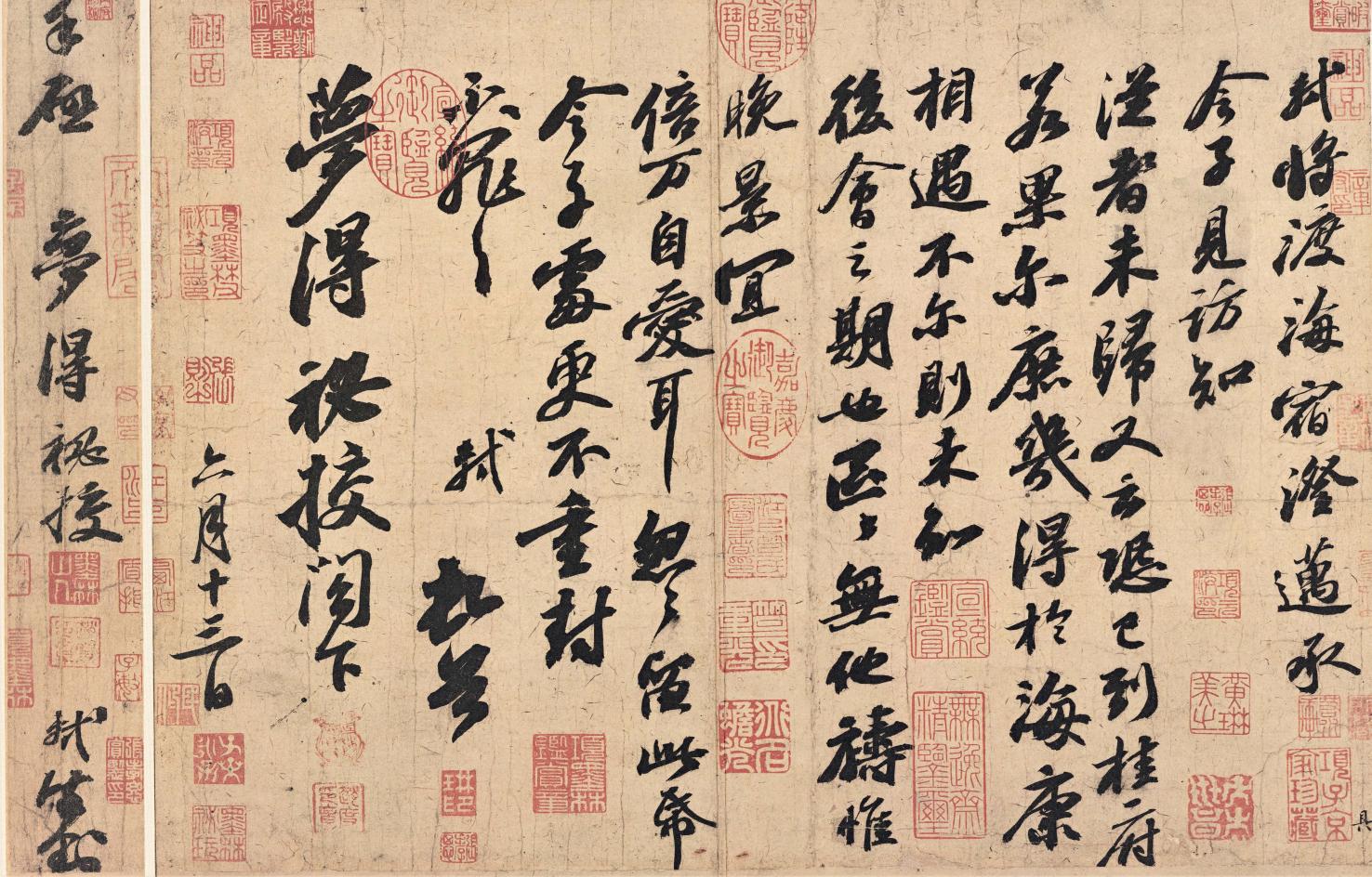 苏轼即将渡海北归时,书有一幅杰作——《渡海帖》,其实它是给朋友赵梦得的一张“留言条”。赵梦得是苏轼流落海南时的挚友,住在澄迈(今海南澄迈),官任秘校。他对苏轼一家颇多关照。苏轼要离开海南岛了,自然要与梦得告别。结果梦得不在岛,因此就写了这张“留言条”,让梦得的儿子转交。苏轼在“留言”中说,以后也许还能再见,也许再也见不上了,唯一的期望是“您晚年倍加爱护自己”。