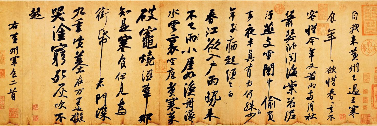 诗的意境与书法的意境为何差异如此之大?因为诗的初稿今天已见不到了,这篇书法很可能是苏轼离开黄州后所书——书在黄州,通常不会写“右黄州寒食二首”。并且这么长的诗,如果是起草的第一稿,会有明显的涂改。