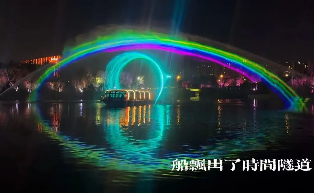 项目打造的2.3公里水上夜游航线,以"水上—桥体—岸边"三位一体的数字展演体系为核心, 将照明技术与AR特效、全息投影、雾森水效等数字手段深度融合 ,创造出55分钟的沉浸式体验流程。这种多维融合的设计思路,彻底改变了传统照明的辅助属性,使其成为数字场景构建的核心载体。