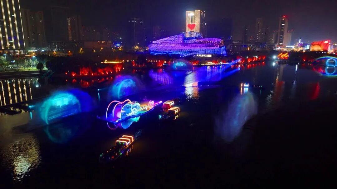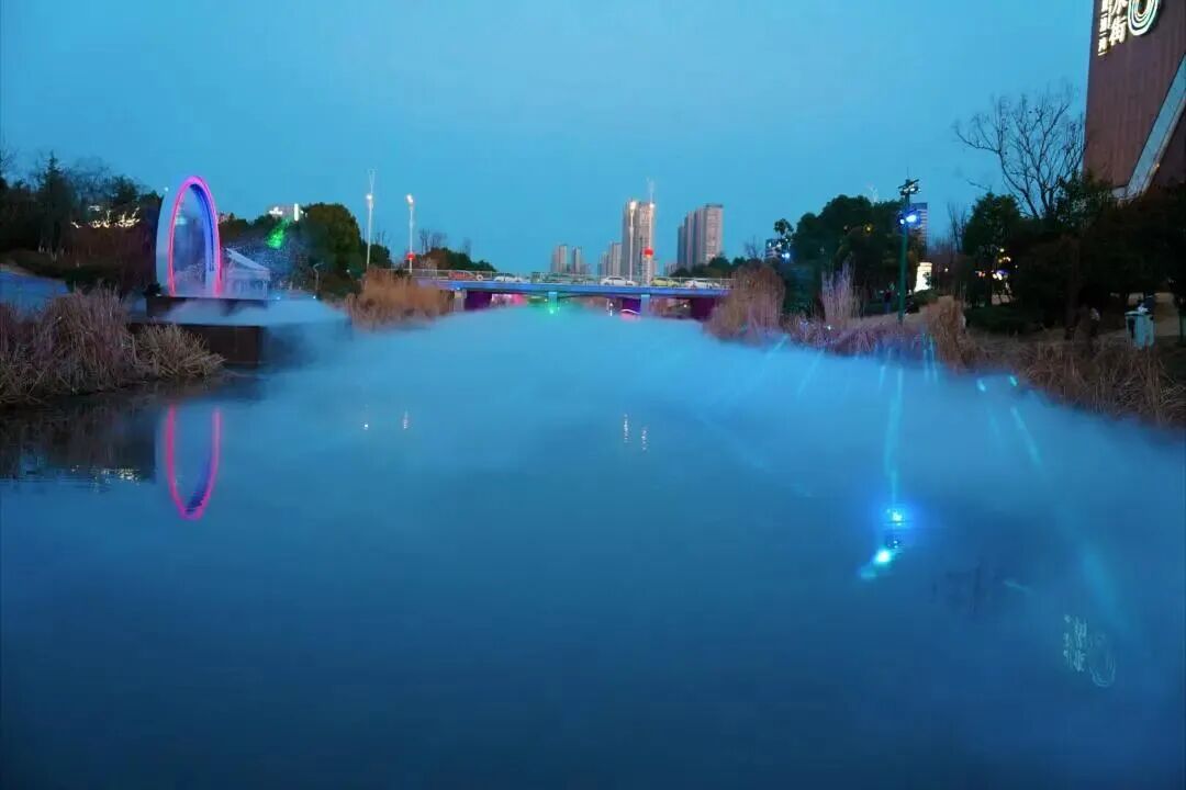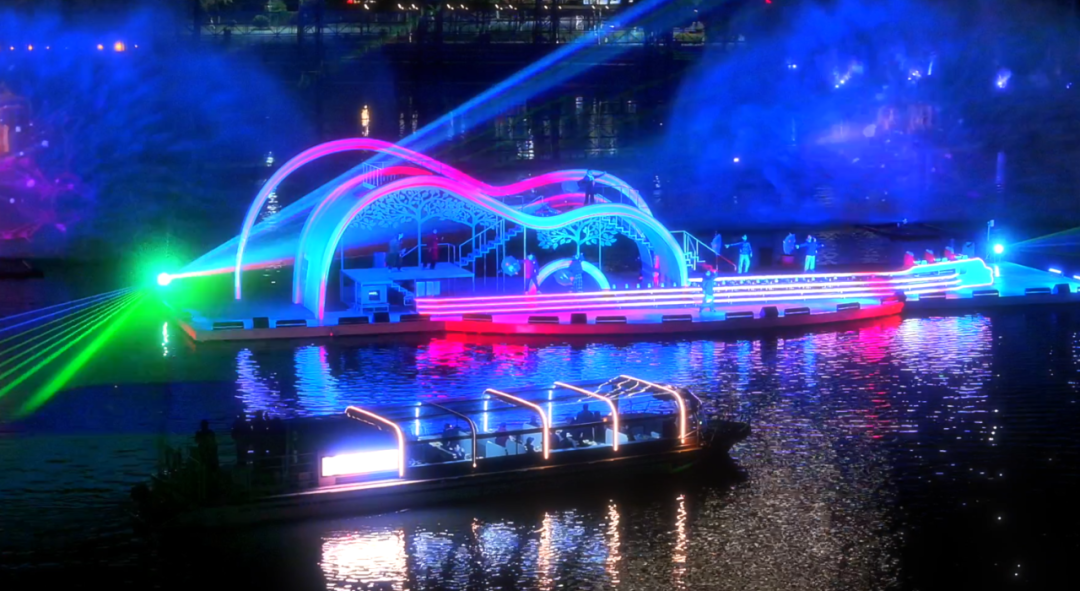 在雾森秘境场景中,桥洞内侧的定制化照明与雾森系统联动,灯光透过水雾形成漫反射效果,配合 水墨动画,让游船仿佛穿越进动态数字画卷——这种 "实体光影+虚拟特效" 的融合,正是项目数字化创新的典型体现。行至湖面中央的吉他艺术舞台时,船顶玻璃缓缓开启,舞台轮廓照明与6个水幕投影同步触发,阜阳原创民谣的旋律与光影节奏精准匹配, 游客既能欣赏实体灯光勾勒的吉他造型,又能观看水幕上投射的城市数字影像 ,实现听觉、视觉、触觉的多感官沉浸。