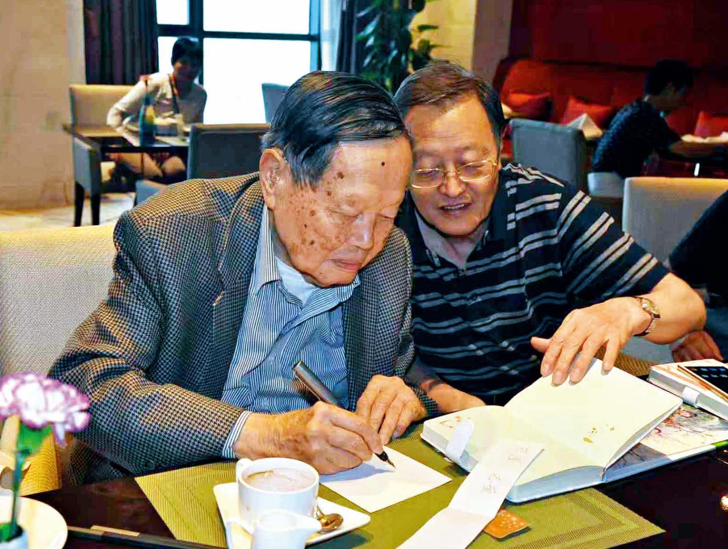 2018年,杨振宁(左)回合肥工作,抽空与亲人见面。图中的他正要为杨振和带来的照片题字留念。(杨振和供图)