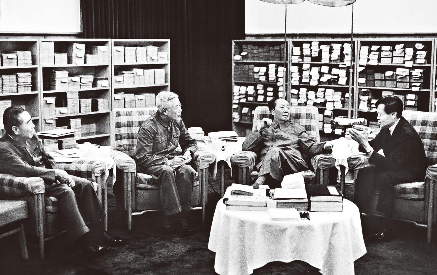 1973年7月17日,毛泽东会见了回国探亲、访问的杨振宁(右一)。(新华社记者 杜修贤/摄)