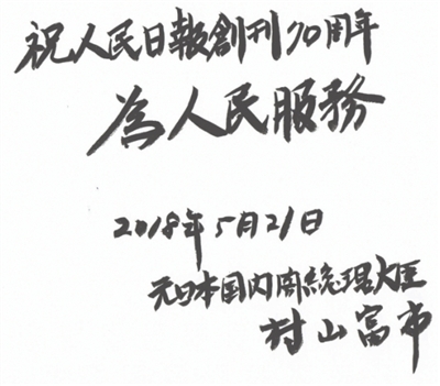 2018年5月21日,村山富市为人民日报创刊70周年题写的致辞。 以上图片均为刘军国提供