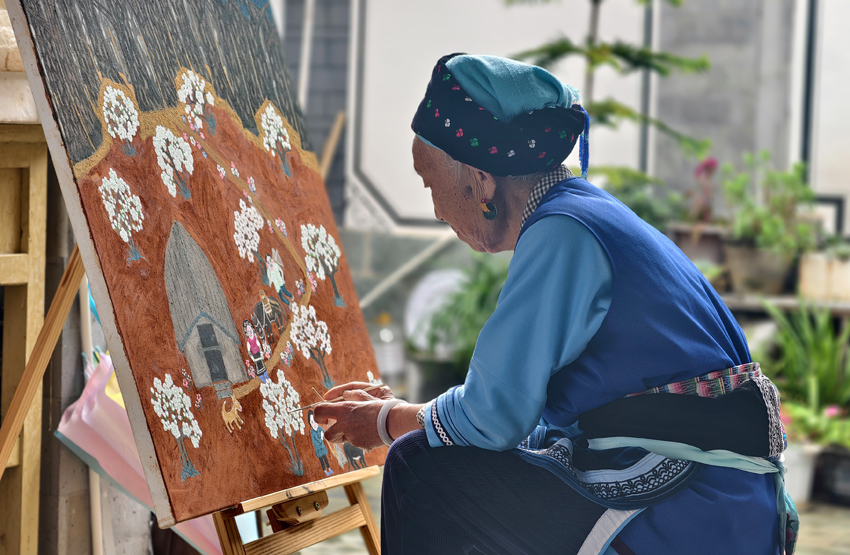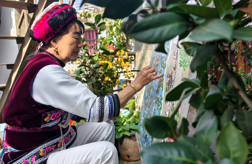 “我画的都是我们大理的故事,还有我自己经历的生活。”王秉秀左手抬着调色盘,右手熟练地在画布上勾勒涂抹。因身体原因,她的头和手会不由自主地轻微颤抖,但这并没有影响到她创作,浓烈的色彩、细腻的线条,描绘出她记忆中的生活场景。