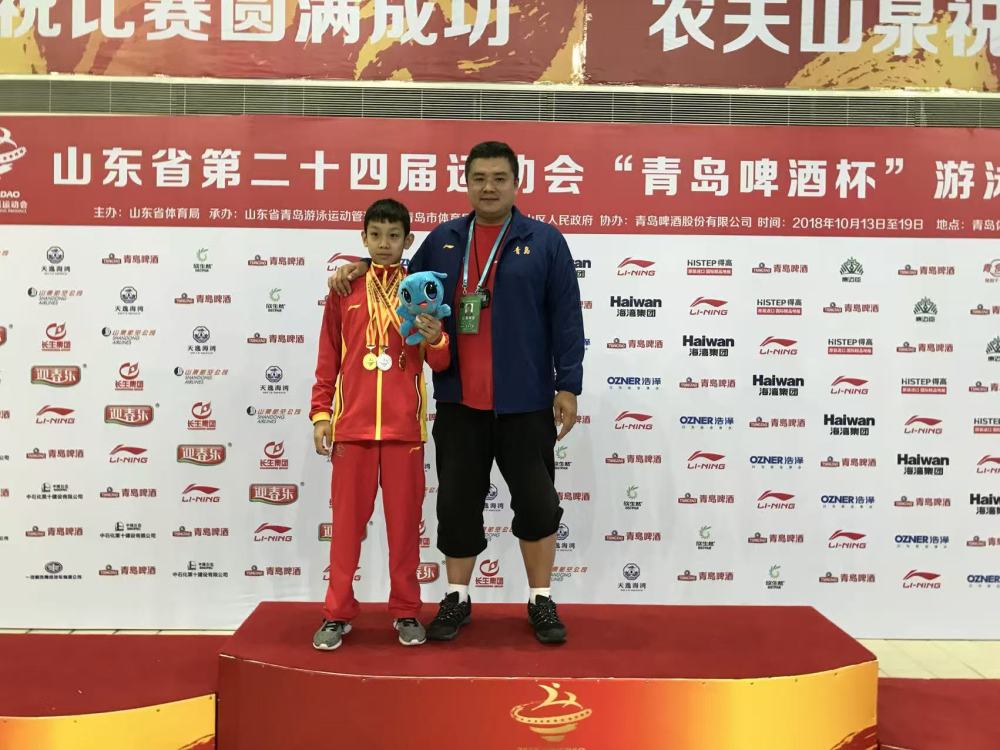 2018年,张展硕(左)在山东省第24届运动会上与教练员柳子谦合影。青岛市体育局供图