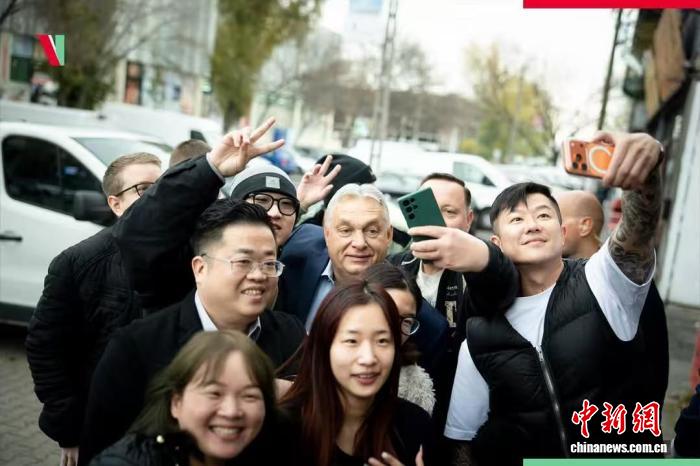 欧尔班在唐人街中餐馆前与匈中民众合影。(图源:欧尔班社交媒体账号)
