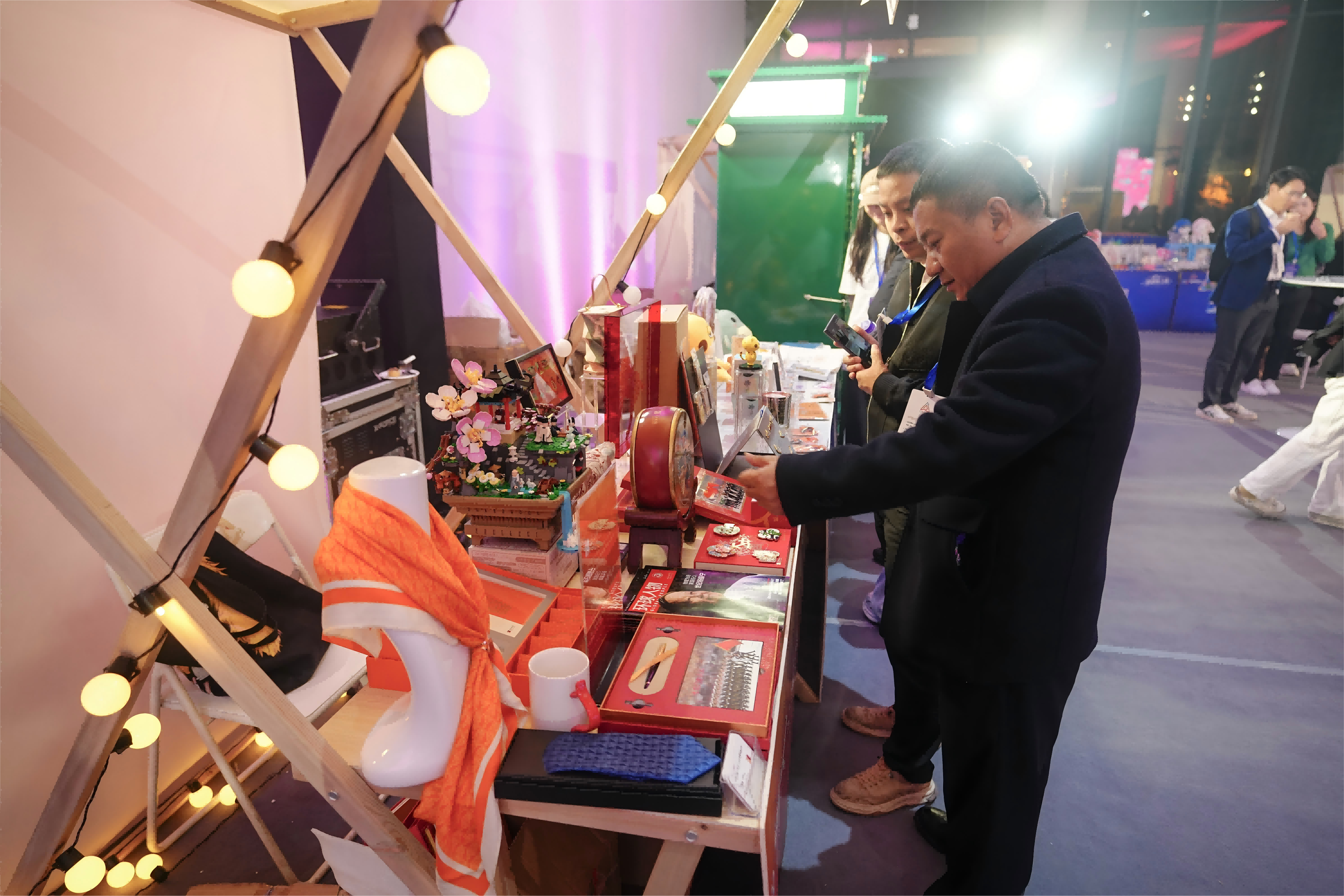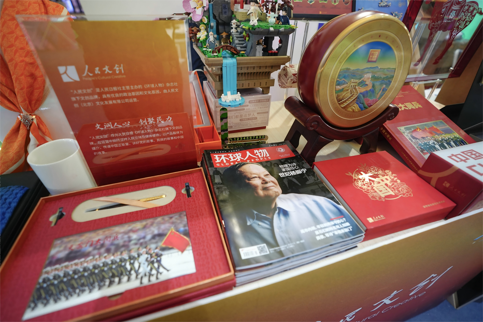 现场嘉宾被人民文创参展产品吸引,纷纷驻足了解。
