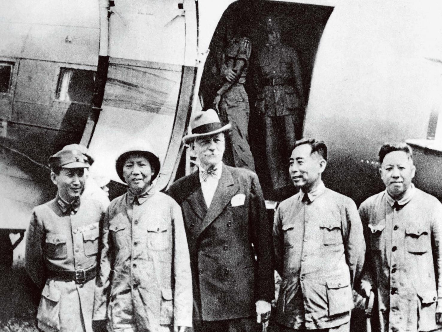 1945年8月28日,即将赶赴重庆谈判的毛泽东(左二)、周恩来(右二)、王若飞(右一),与负责陪同的美国驻华大使赫尔利(左三)和国民党代表张治中(左一)在延安合影。(视觉中国)