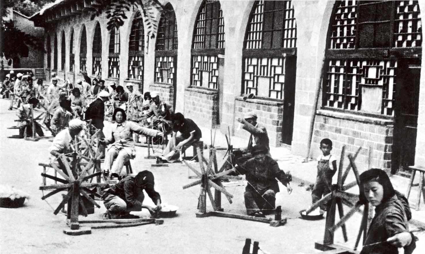 20世纪30年代末到40年代初,抗日根据地开展了大生产运动,所有干部和眷属都参加劳动。图为延安当时的纺纱景象。(视觉中国)