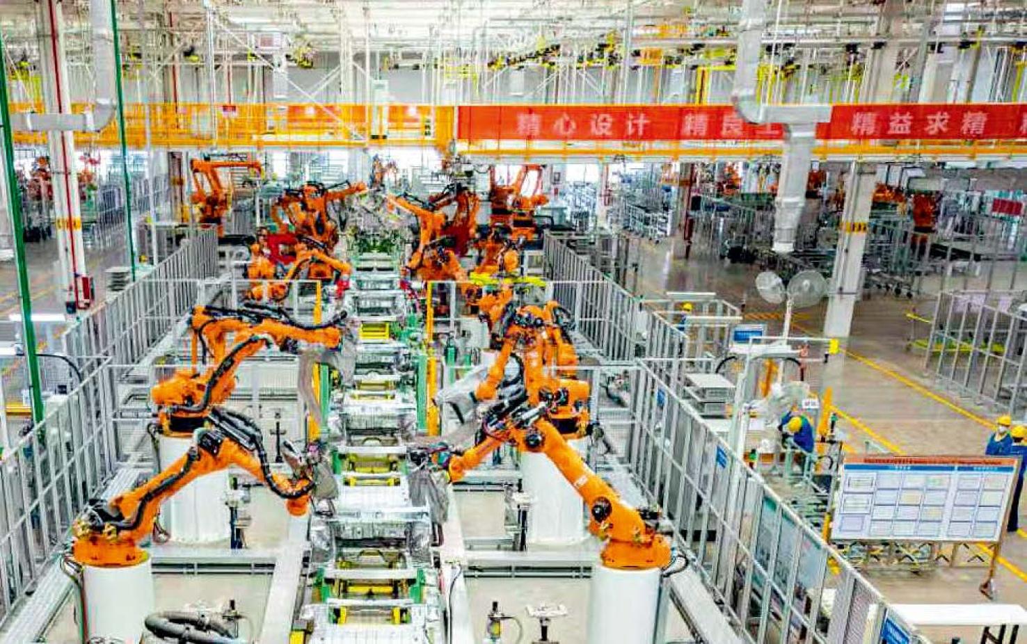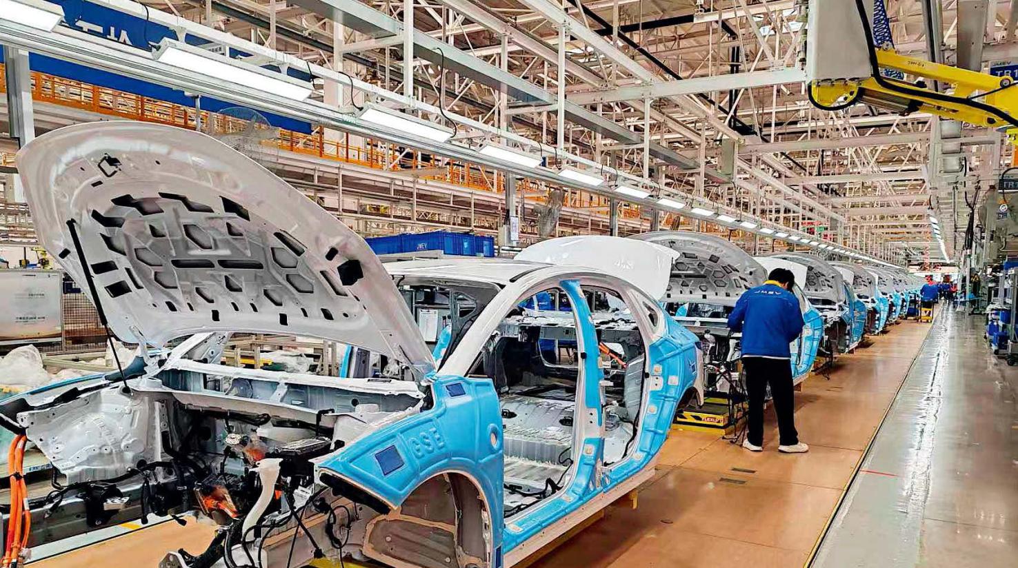 江西江铃集团新能源汽车有限公司焊装车间内,自动化机械臂正全速运转。