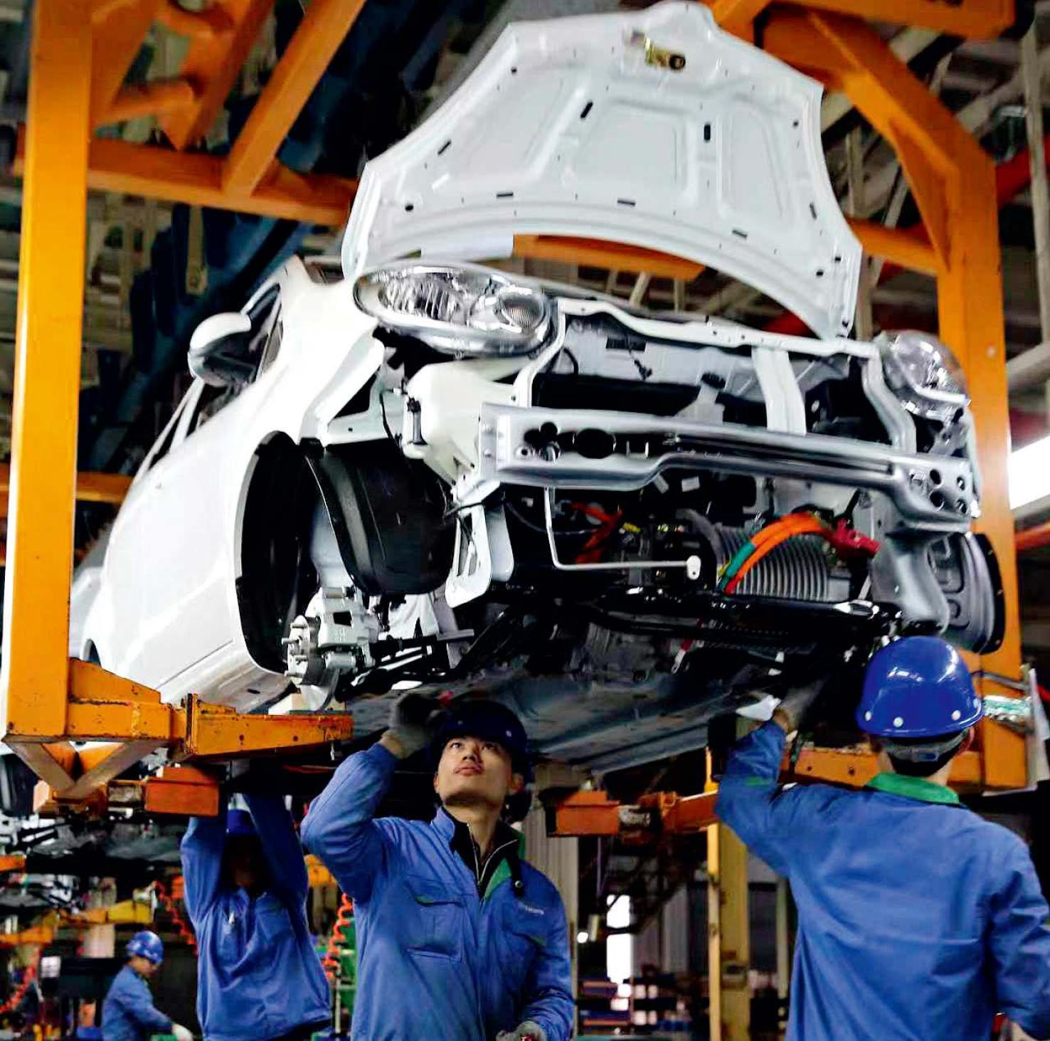 江西江铃集团新能源汽车有限公司生产线上,工人们正在加紧组装新能源汽车。