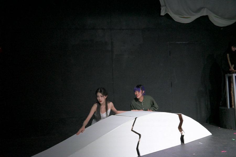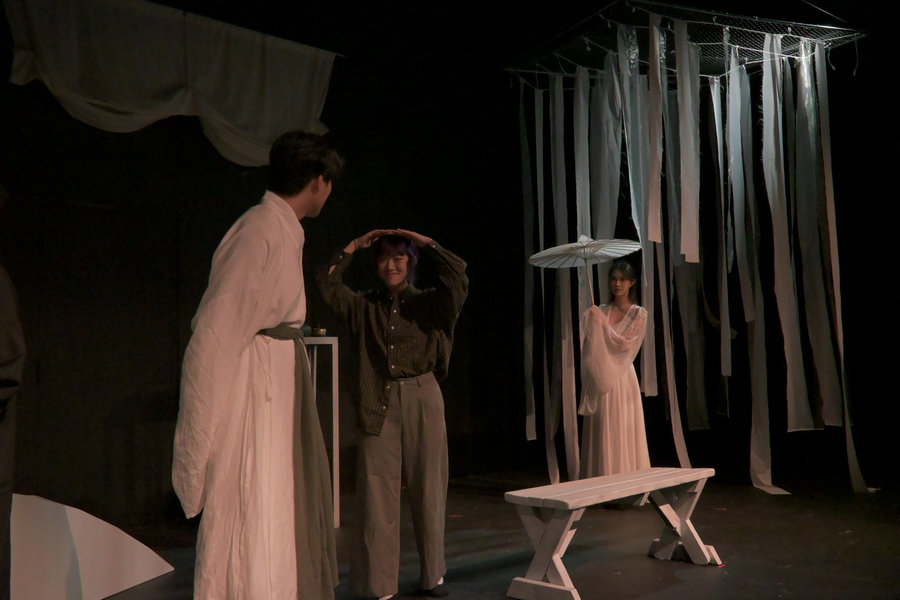 A scene from the performance of Qingbai: Innocence at Brown University on Dec 6 features He Chuning as Bai Suzhen, Xu Meimei as Xiaoqing, and Liu Zhiyi, another student at Rhode Island School of Design, as Fahai. [Photo provided to chinadaily.com.cn]
