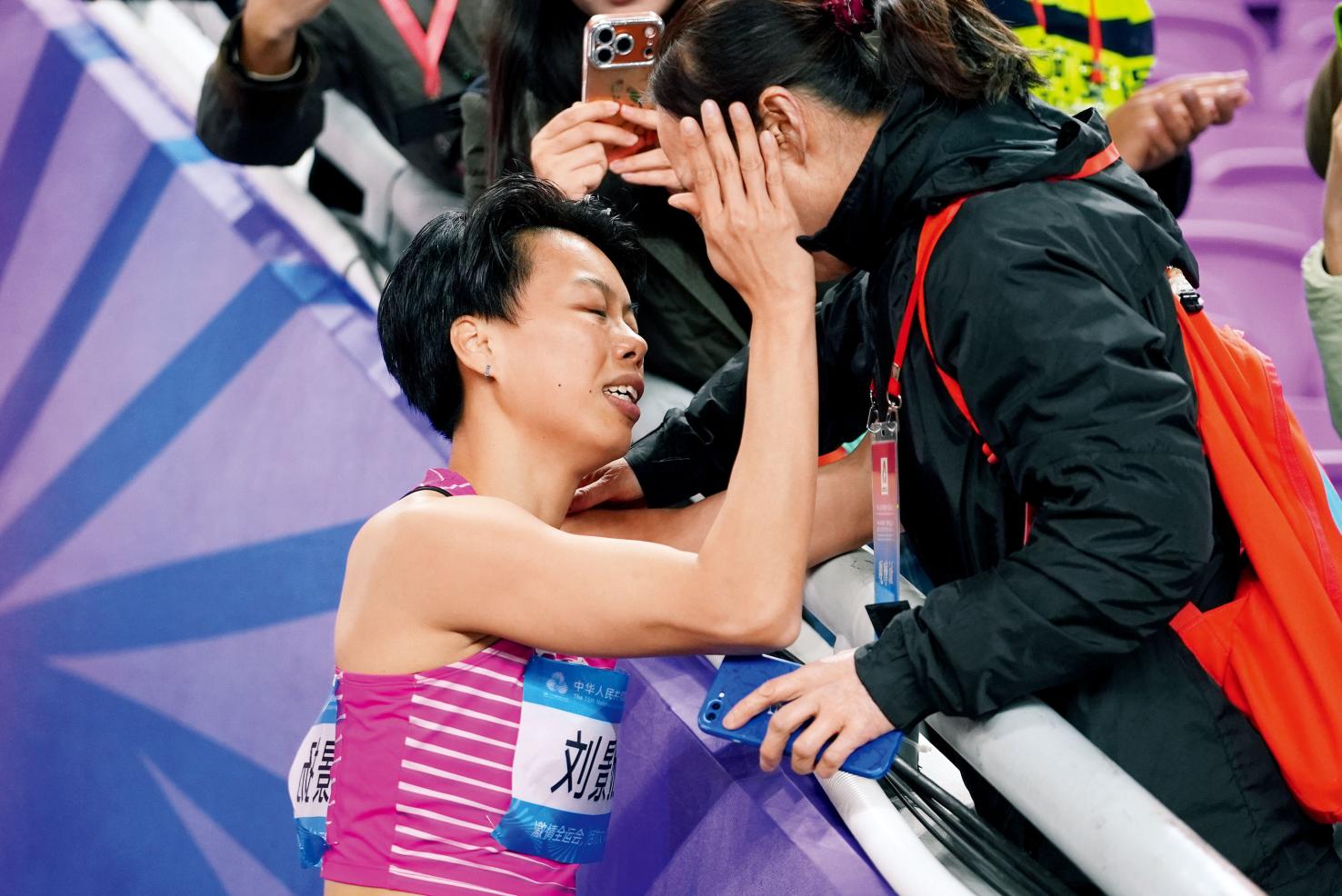 在全运会夺冠后,刘景扬冲向看台,用力抱紧浑身发抖的母亲,大喊“我做到了”。在集训、比赛的间隙,她常给母亲打电话,聊聊近况,说想念母亲做的凉拌洋葱。那是家的味道,也是她一路奔跑的源头。