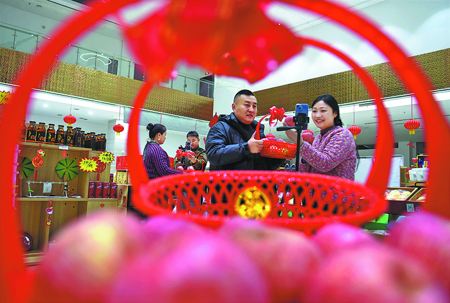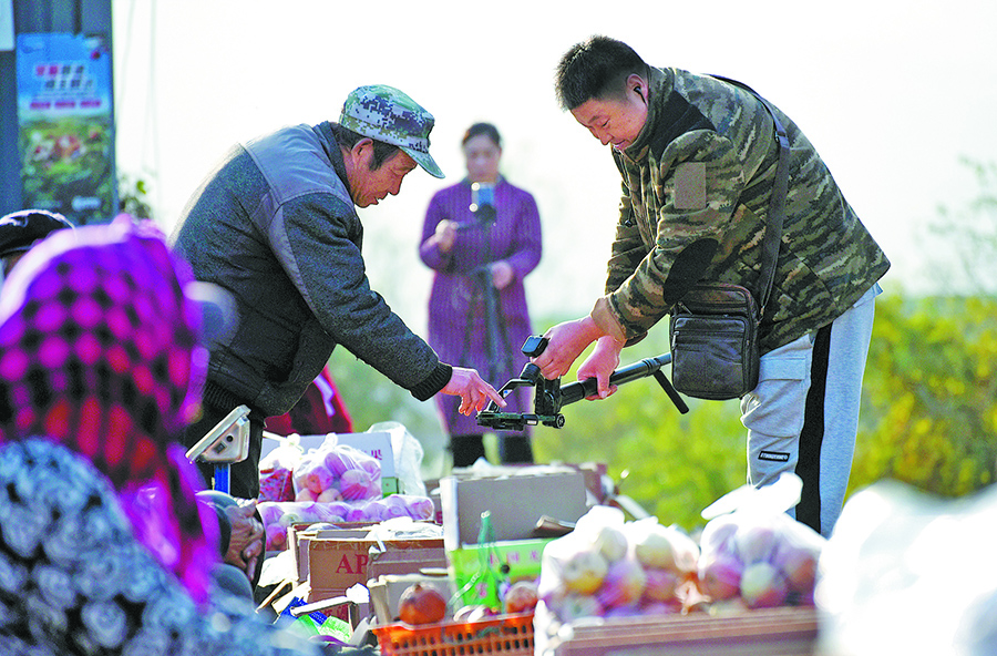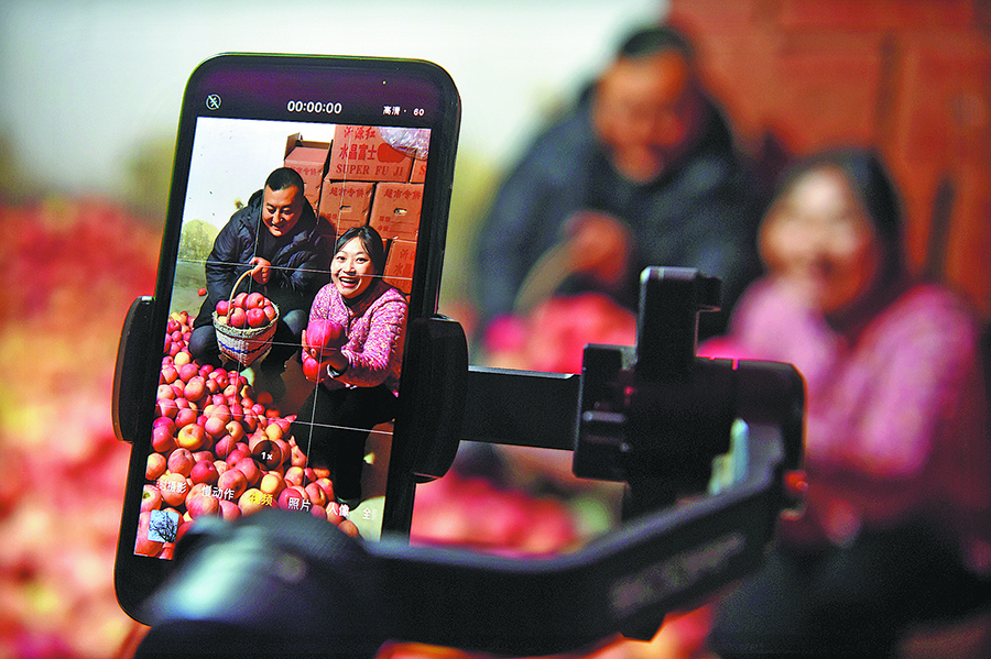Livestreamers introduce local apples from the Zhuquan apple market in Zhongzhuang township, Zibo city, Shandong province, on Nov 9. [Photo provided by Zhao Dongshan/You Kuikui/For China Daily]