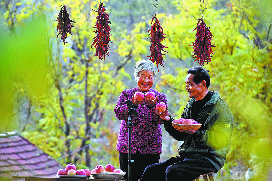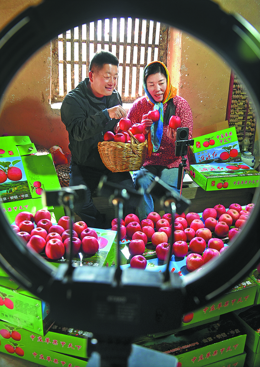 During the apple harvest season in the mountainous Zhongzhuang township in Zibo city, Shandong province, many couples are busy weaving through orchards brimming with ripe fruit. They create promotional videos, livestream and sell red apples through online platforms.
