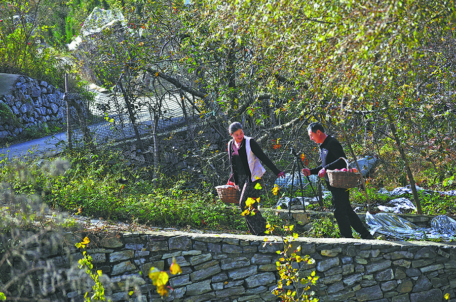A couple sells apples in their courtyard in Zhongzhuang township, Zibo city, Shandong province, on Nov 6. [Photo provided by Zhao Dongshan/You Kuikui/For China Daily]