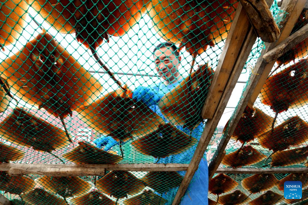 A fisherman dries fish in Jimo District of Qingdao, east China's Shandong Province, Jan. 6, 2026. (Photo by Liang Xiaopeng/Xinhua)