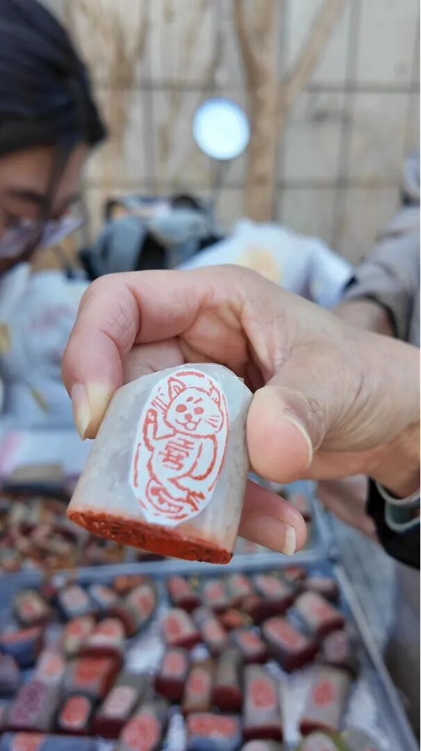 午后的杨梅竹斜街,暖融融的阳光淌过灰墙黛瓦。旧电动车安静地驶入街角,一位白发老人利索地停稳车,不紧不慢地支起小摊——印石、刻刀、印泥依次摆开,托盘中渐渐铺满小猫、小狗、葫芦等各式印章,椅子上夹住的“预约定制动物印章须知”在微风里轻晃。不过片刻,摊位已被慕名而来的年轻人围了一圈又一圈。