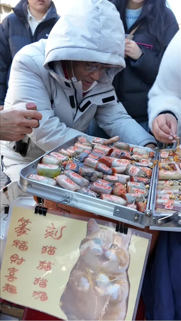 摊主是一位年近古稀的老人,此刻正戴着老花镜,手握刻刀站在摊位旁,全神贯注地雕琢一块青石,不到十分钟,石面上便浮现出一只蜷缩睡觉的小猫。这位因刻宠物印章而意外走红的“网红大爷”,此刻神情专注如初,仿佛周遭的热闹与他无关。