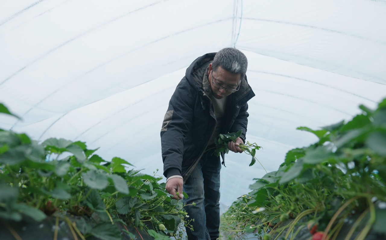 波特家庭农场的草莓大棚里透着生机,农场主严特波俯身在一垄垄翠绿的植株间,指尖轻托起一颗带着淡淡光泽的粉色草莓。