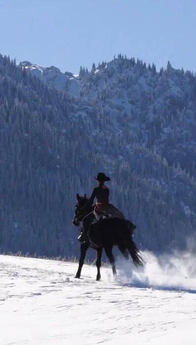 马蹄扬起碎雪,红斗篷迎风猎猎作响。她没有停下,也没有回头,而是带着那份独有的豪情与温柔,策马奔向了更远、更辽阔的群山深处。