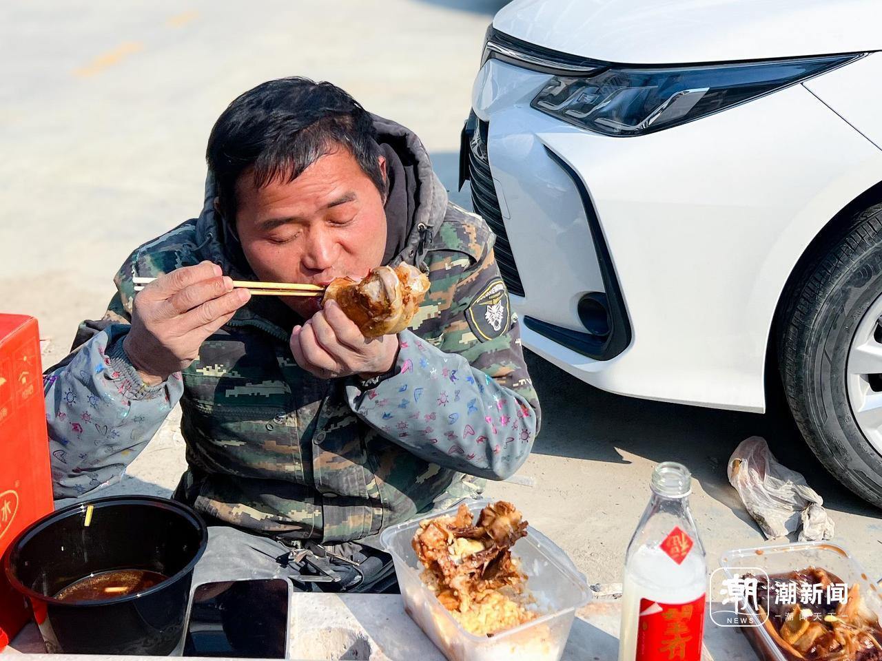 网友们看到他们头戴安全帽、工装沾着灰浆,却总在接过饭盒时露出憨厚笑容;看到他们蹲在地上大口吃饭,吃得香,也吃得踏实;看到他们互相招呼、帮着维持秩序,像一个临时却温暖的大家庭。