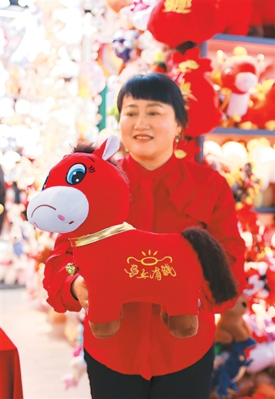 Zhang Huoqing holds the viral crying horse toy in front of her store at Yiwu International Trade Market in Yiwu, east China's Zhejiang Province. (Photo courtesy of the interviewee)