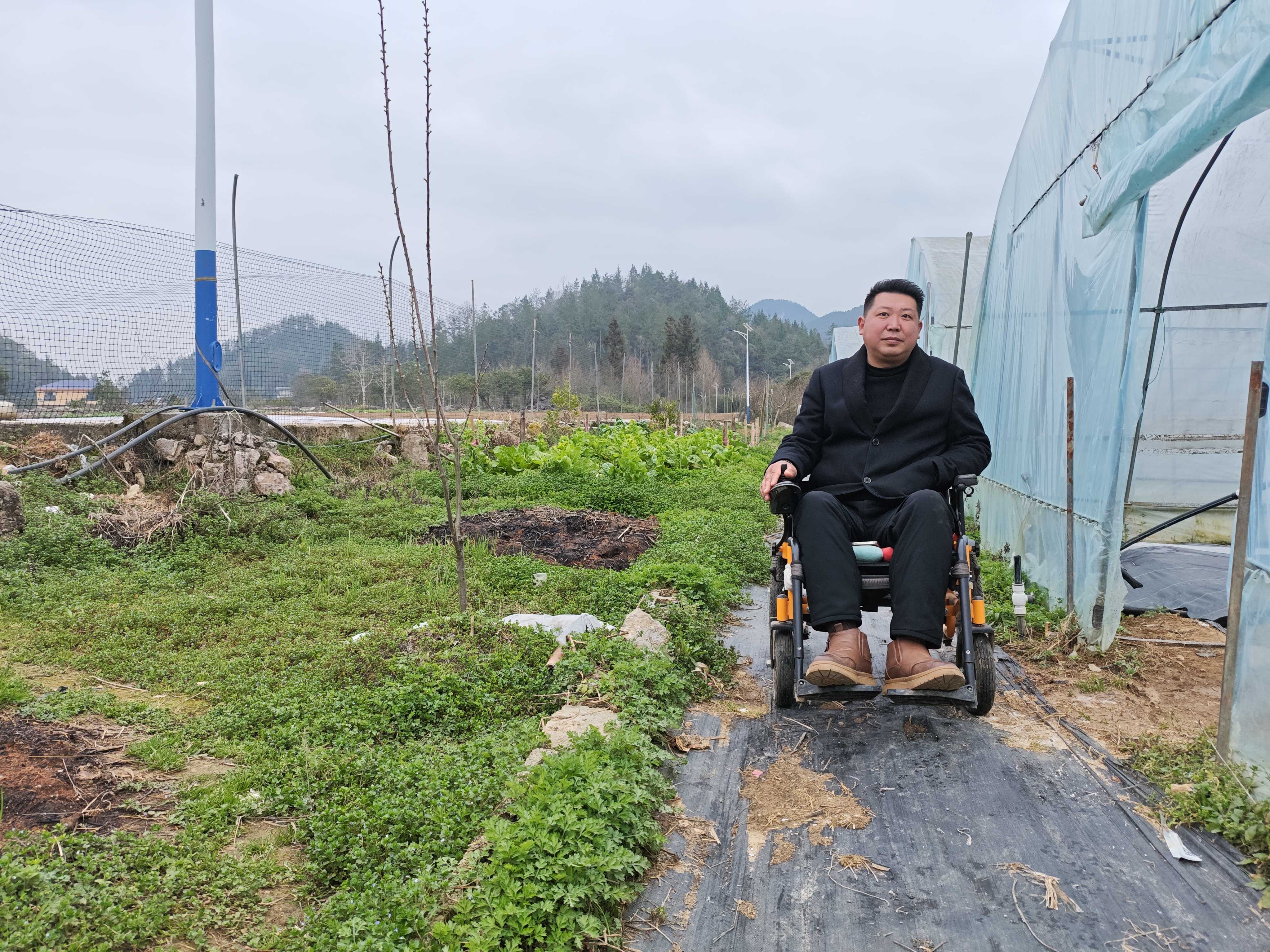 田远红用电动轮椅在蔬菜苗圃大棚之间穿行