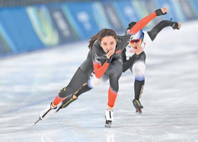 当地时间2月5日,中国速度滑冰队选手韩梅(前)在赛前训练。新华社记者 武 巍摄