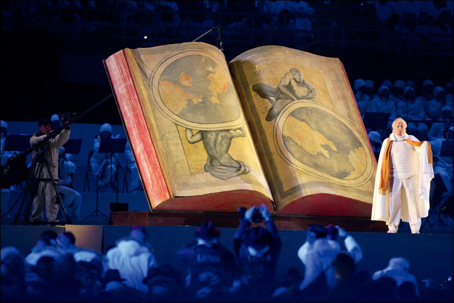 2006年,都灵冬奥会开幕式,3米多高的一本《神曲》被置于舞台中央。其中的著名诗篇《尤利西斯的独白》——尤利西斯鼓励追随者升起风帆,驶向西方的大海,去追求新知和人性的美德——被表演者高声朗诵,瞬间点燃现场。