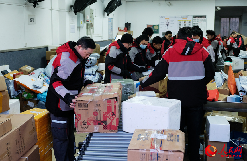 春节前包裹量攀升,任秀林认真分拣、细致查验,守护年货安全。人民网记者 常力元摄