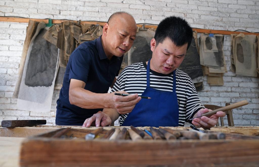 俞友鸿(左)在教授徐家田雕刻技艺(2024年9月20日摄)。新华社记者万象 摄