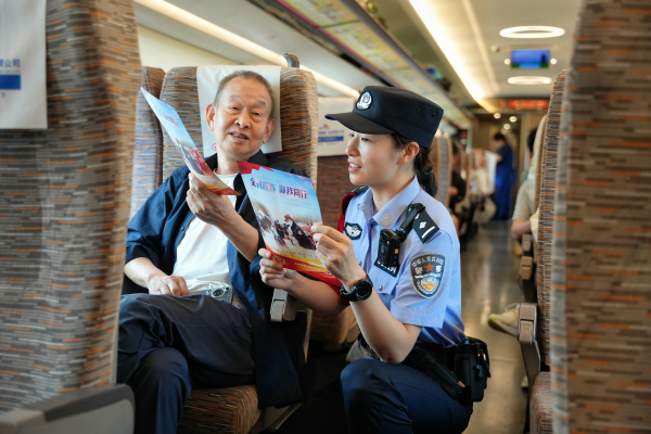 图为石家庄铁路公安处乘警支队乘警鲁倩在为旅客进行反诈宣传。 贾义涵 摄