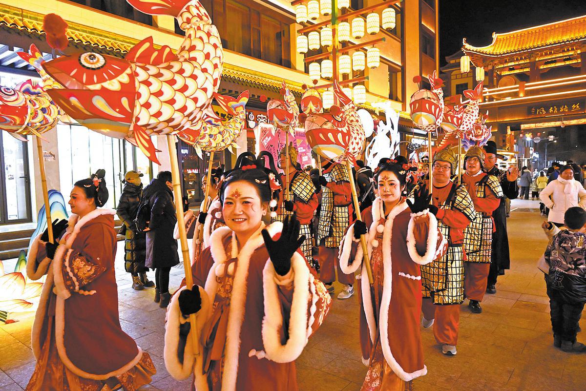 Performers carrying fish lanterns parade on Jan 13 through a street of the Dunhuang Night Market in Dunhuang, Gansu province. ZHANG XIAOLIANG/FOR CHINA DAILY