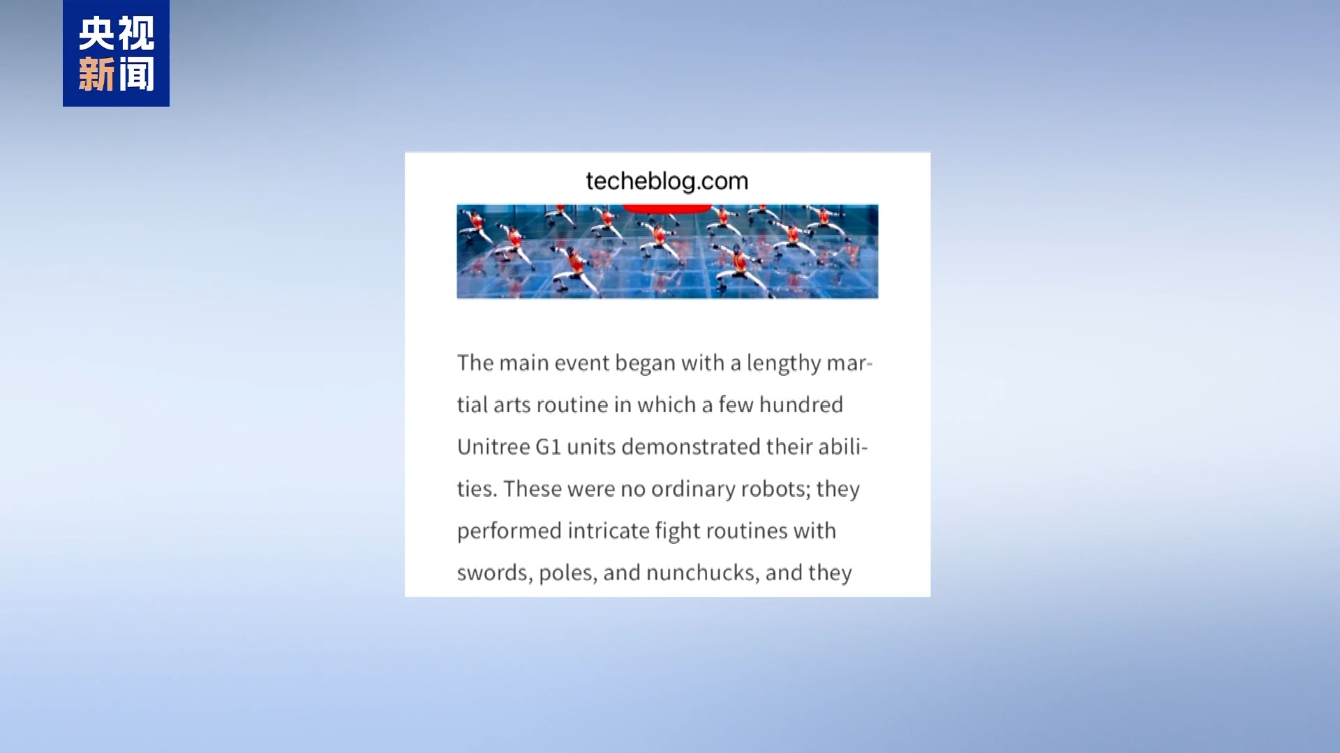 文章称,在一段武术表演中,“十几台人形机器人进行了复杂的武术动作”,“这些武术场景展示了机器人协调和故障恢复方面的创新”。