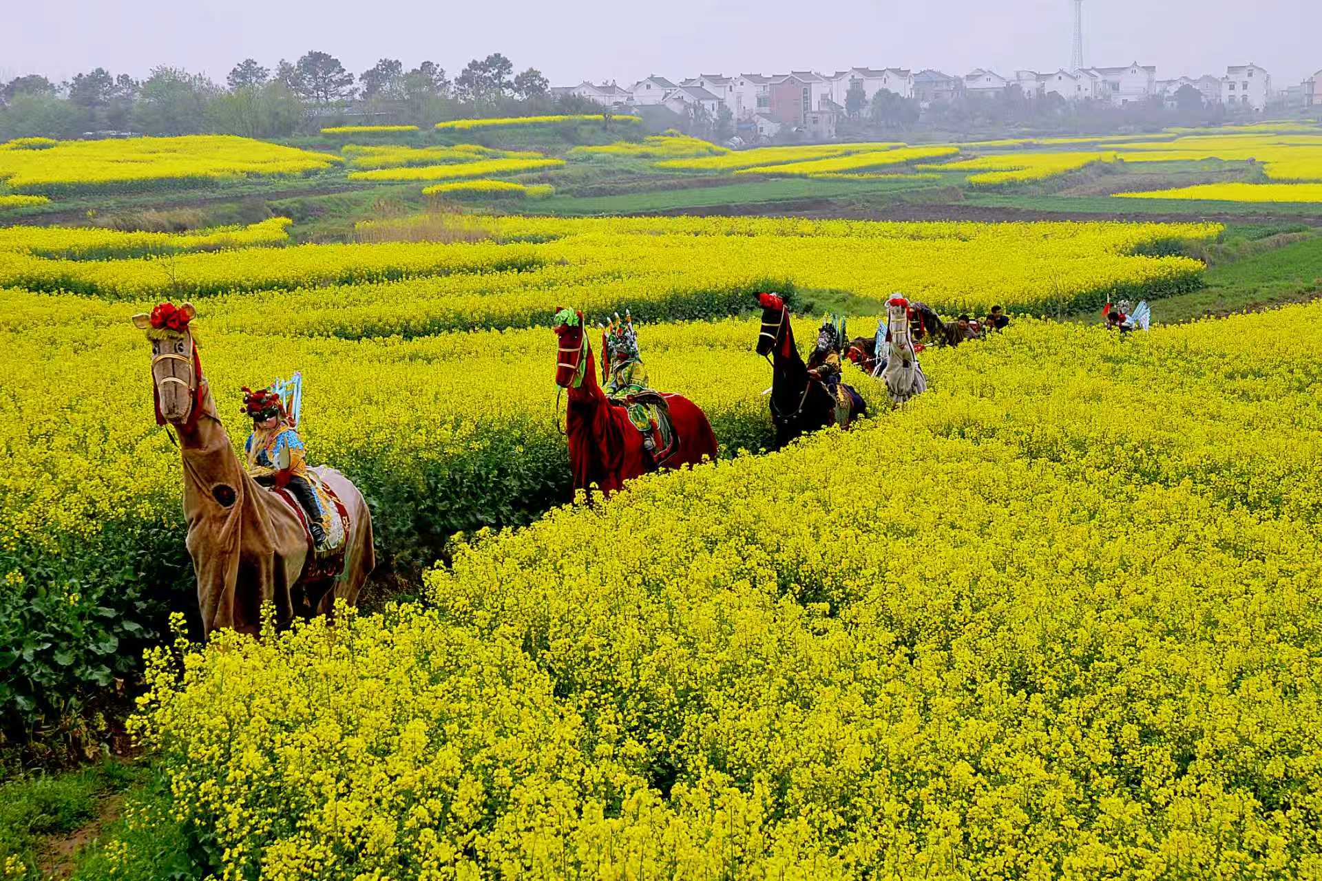 古胥河畔,南京高淳“东坝大马灯”的表演好不热闹。7个娃娃身骑“竹马”,扮上花脸,衣着戏袍:绿衣是关羽,黑脸的是张飞,骑白马的是赵云……7匹“竹马”之下,各有两名成年人默契配合,前一人戴道具扮马头,后一人屈身披锦作马身,演绎战马的静立和奔腾。令旗所指,摆出三角阵、四角阵、梅花阵……