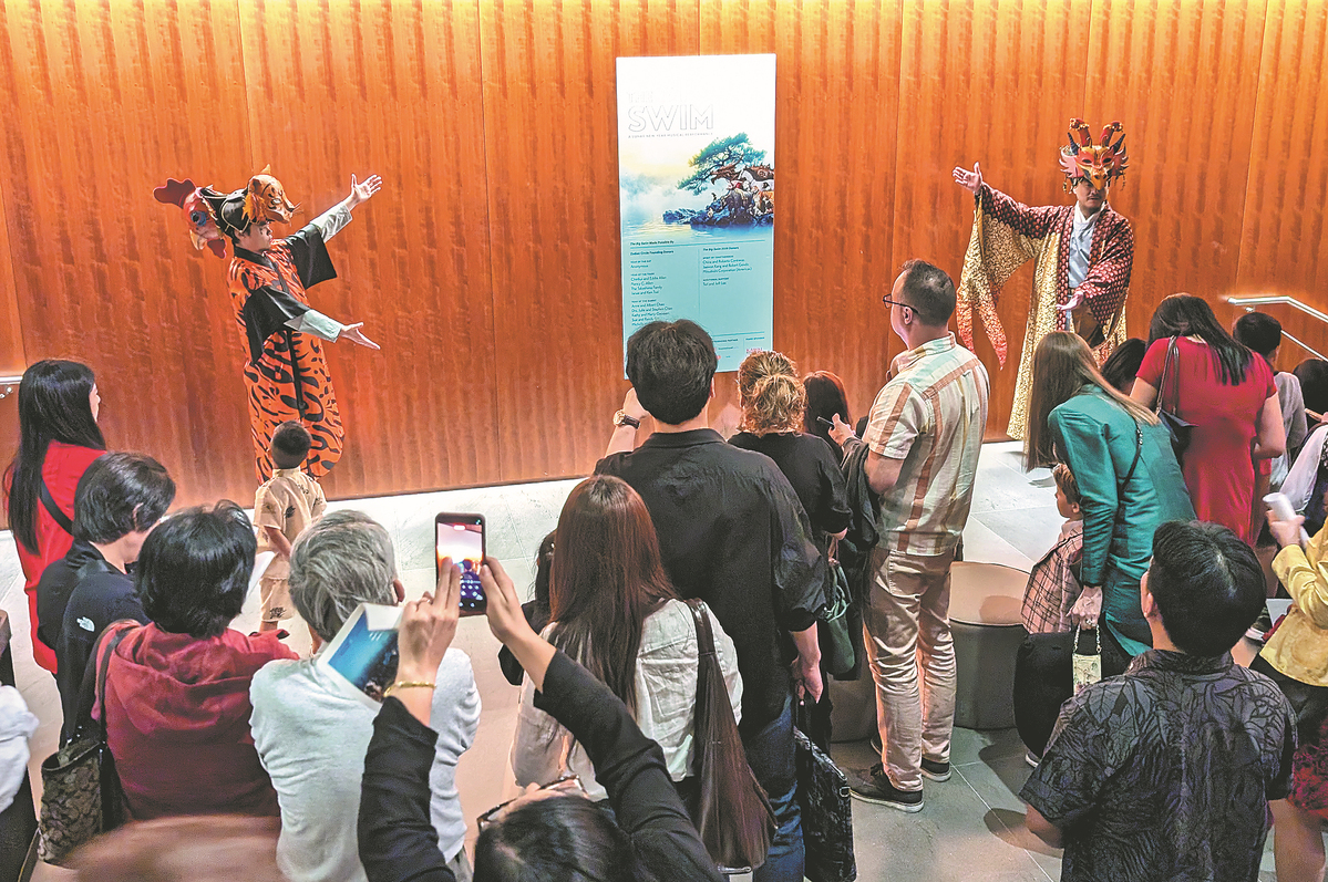 Two opera singers, dressed as a tiger and dragon, welcome the audience to watch The Big Swim on Feb 20 at Asia Society Texas in Houston. [Photo by May Zhou/China Daily]