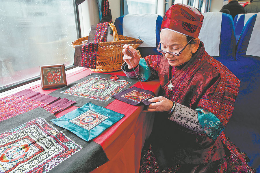 An artisan focuses on her needlework, showcasing ethnic embroidery aboard train No 5640. [Photo by Liu Boqian/For China Daily]