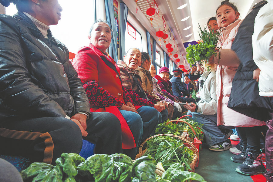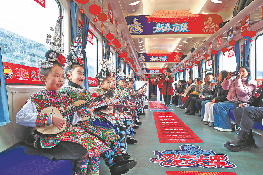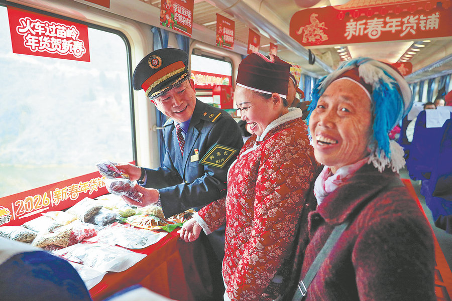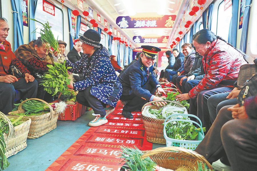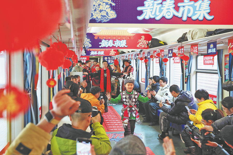 Ahead of the Chinese New Year holiday, on Feb 8, two slow passenger trains winding through Guizhou's mountains were transformed into pop-up marketplaces.