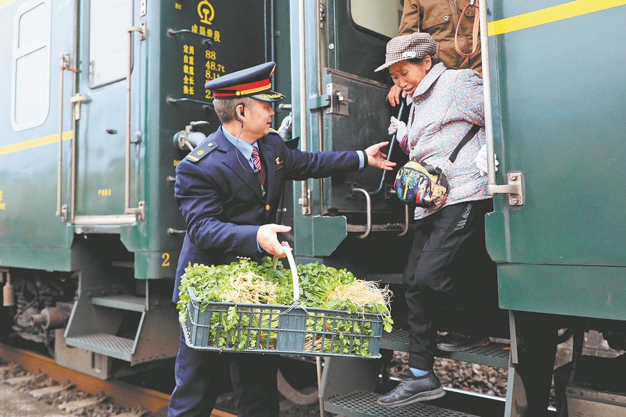An attendant helps villagers carry fresh produce off the train. [Photo by Zhang Guizhong/For China Daily]
