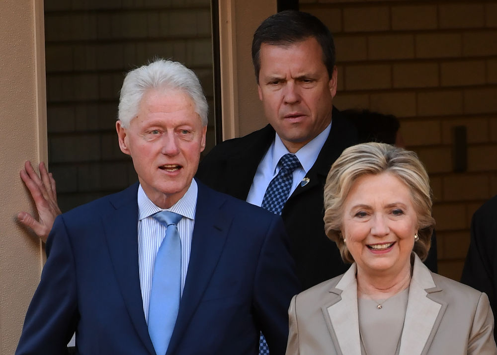 2016年11月8日,在美国纽约州查帕阔一处投票站,希拉里·克林顿(前右)与她的丈夫、前总统比尔·克林顿参加大选投票。新华社记者殷博古摄