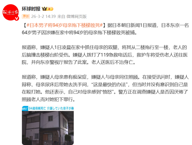 报道称,嫌疑人1日凌晨在家中抓住母亲的双腿,将其从二楼拖行至一楼,老人的后脑撞击楼梯台阶受伤。嫌疑人拨打了119急救电话后,救护车将受伤老人送往医院,并向东京警视厅报告了此案。老人送医后不治身亡。