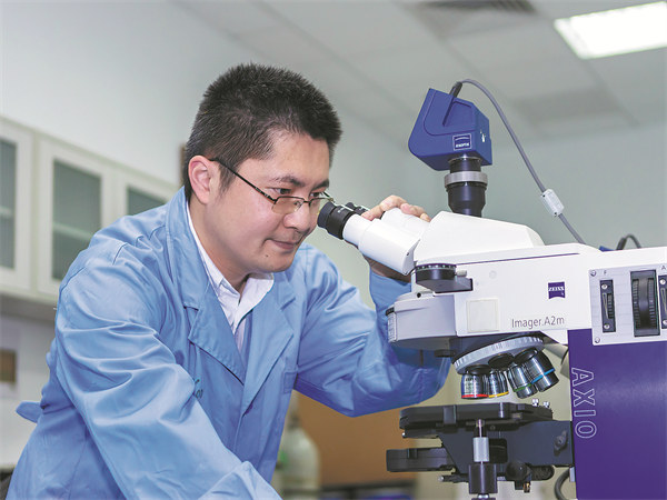 Yan Kaiqi observes hollow glass microspheres under a microscope at a laboratory in 2021. [Photo provided to China Daily]