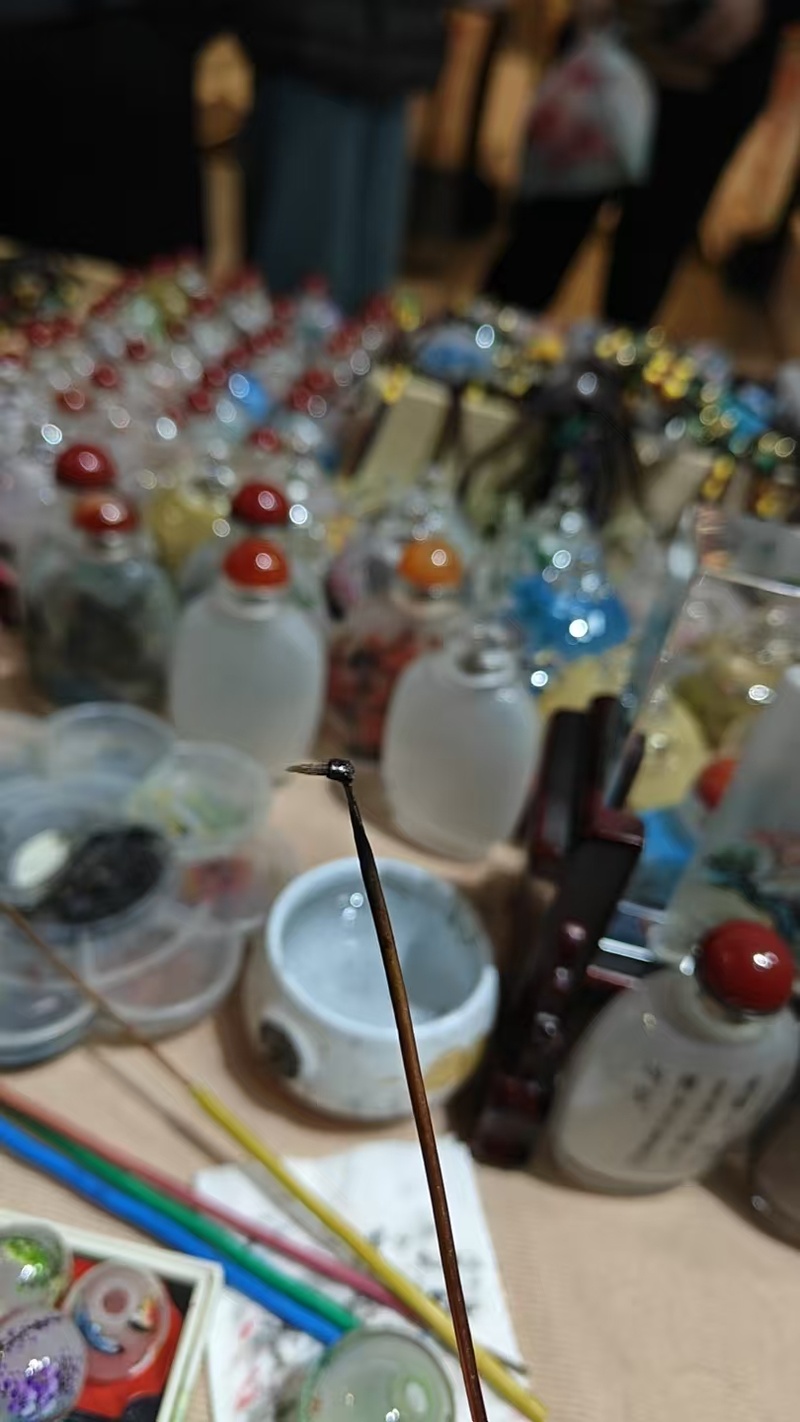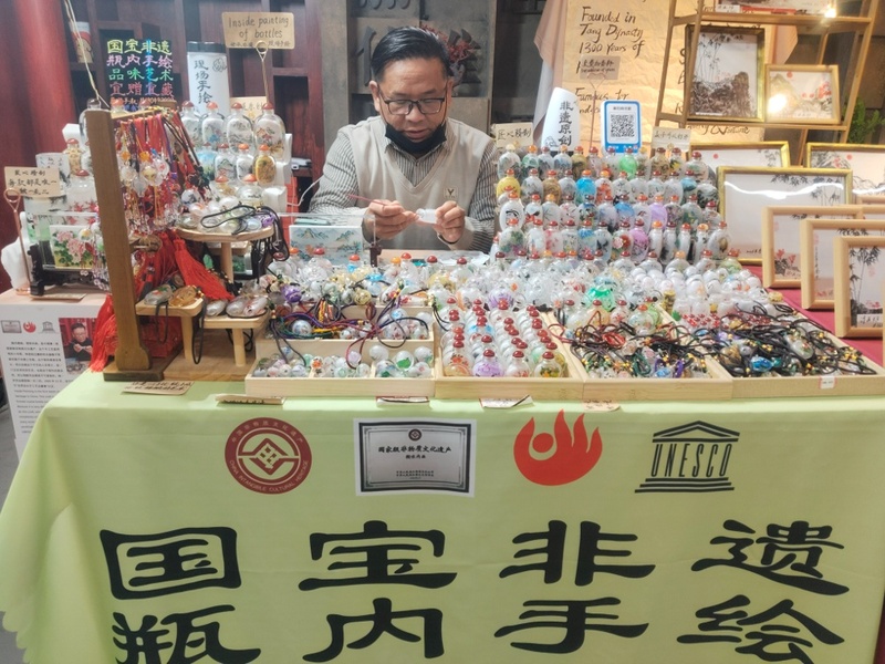 “这叫内画,又称瓶内壁画,发源于清代北京,是国家级非物质文化遗产,还被联合国教科文组织授予‘世界杰出手工艺品徽章’认证,是十分珍贵的传统手艺。”创作者文石向记者介绍。