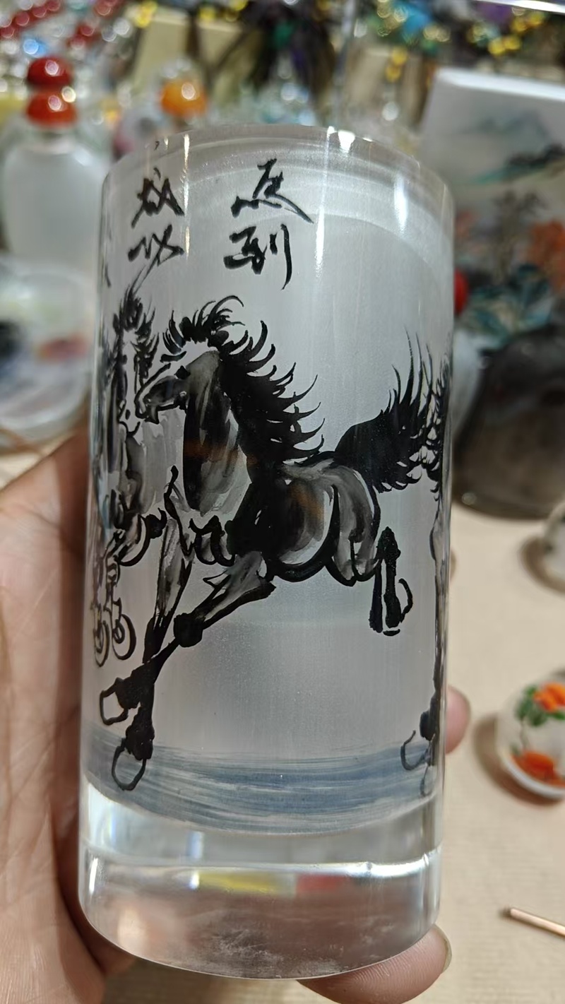 只见他凝神屏息,将特制弯钩细笔缓缓探入瓶中,手腕轻转、笔尖顿挫,在透明水晶内壁上勾勒、晕染。在外人看来只是笔尖在瓶中轻晃,瓶内却已是笔墨流转,线条层层叠加,色彩慢慢晕开。方寸之间,山水奔腾、骏马昂首,全都在这一伸一缩、一笔一画间悄然成形。