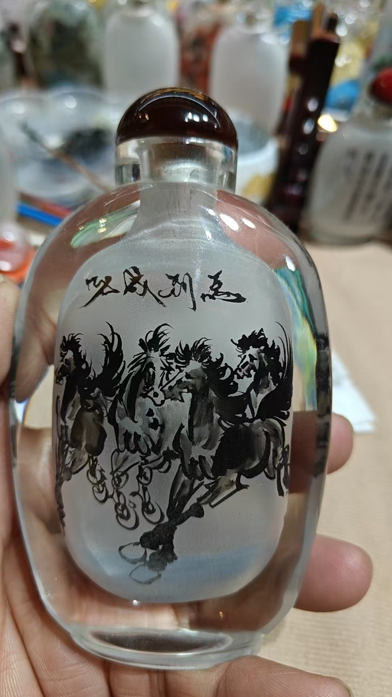 记者看到,工作台上摆满了琳琅满目的内画作品:有绘着山水花鸟的鼻烟壶,有刻画着人物走兽的水晶笔筒,还有巴掌大小的扁形瓶器。一件鼻烟壶正反两侧画着八匹奔腾的骏马,墨色浓淡相宜,鬃毛飞扬,仿佛要从瓶中跃出。