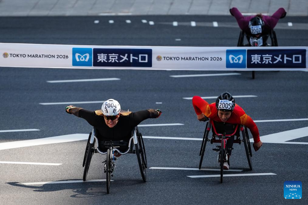 Eden Rainbow-Cooper (L) of Britain and Zhou Zhaoqian of China compete in the women's wheelchair elite race of the Tokyo Marathon in Tokyo, Japan, March 1, 2026. (Xinhua/Jia Haocheng)